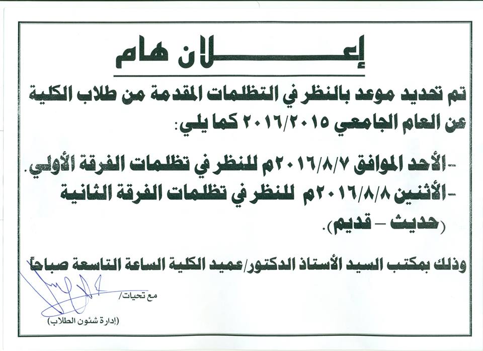 لمعرفة مواعيد  النظر في التظلمات المقدمة من طلاب الكلية للعام الجامعي 2015م/2016م  أنقر هنا