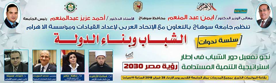 تنظم جامعة سوهاج بالتعاون مع مؤسسة الاهرام ندوات بعنوان ( الشباب وبناء الدولة ) وذلك يوم الاربعاء الموافق 28 / 2 / 2018 الساعة 10 صباحا بقاعة المؤتمرات الكبري بالجامعة القديمة . فعلي من يرغب بالحضور التوجه لمكتب رعاية وتسجيل الاسماء إعلان عن ندوات بعنوان (الشباب وبناء الدولة) تصفّح المقالات إعلان نتيجة الفرقة الأولىإعلان هام