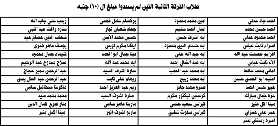 علي الطلاب الآتي أسمائهم الذين لم يسددوا الرسوم الدراسية للعام الجامعى 2016/2017 سرعة سداد الرسوم الدراسية وإلا سوف يتم اتخاذ الاجراءات القانونية.