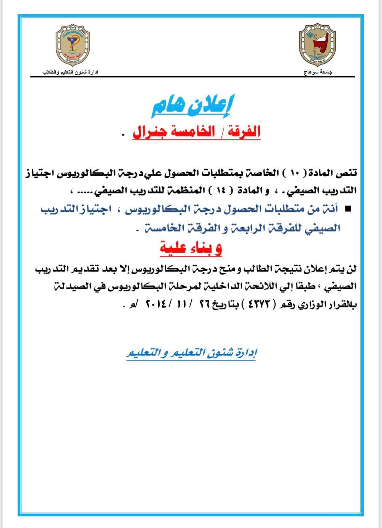 إعلان هام لطلاب الفرقة الخامسة جينيرال إعلان هام لطلاب الفرقة الخامسة جينيرال تصفّح المقالات إعلان هام لطلاب الفرقة الخامسة جينيرالالكشوف النهائية للمقرر الإختيارى لطلاب المستوى الرابع برنامج الصيدلة الإكلينيكية