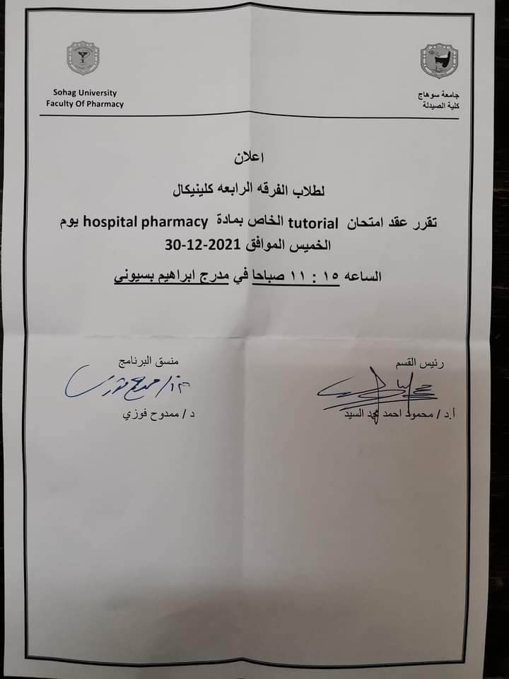 إعلان هام لطلاب الفرقة الرابعة كلينيكال إعلان هام لطلاب الفرقة الرابعة كلينيكال تصفّح المقالات إعلان هام لطلاب المستوى الرابعإعلان هام لطلاب برنامج الصيدلة الإكلينيكية