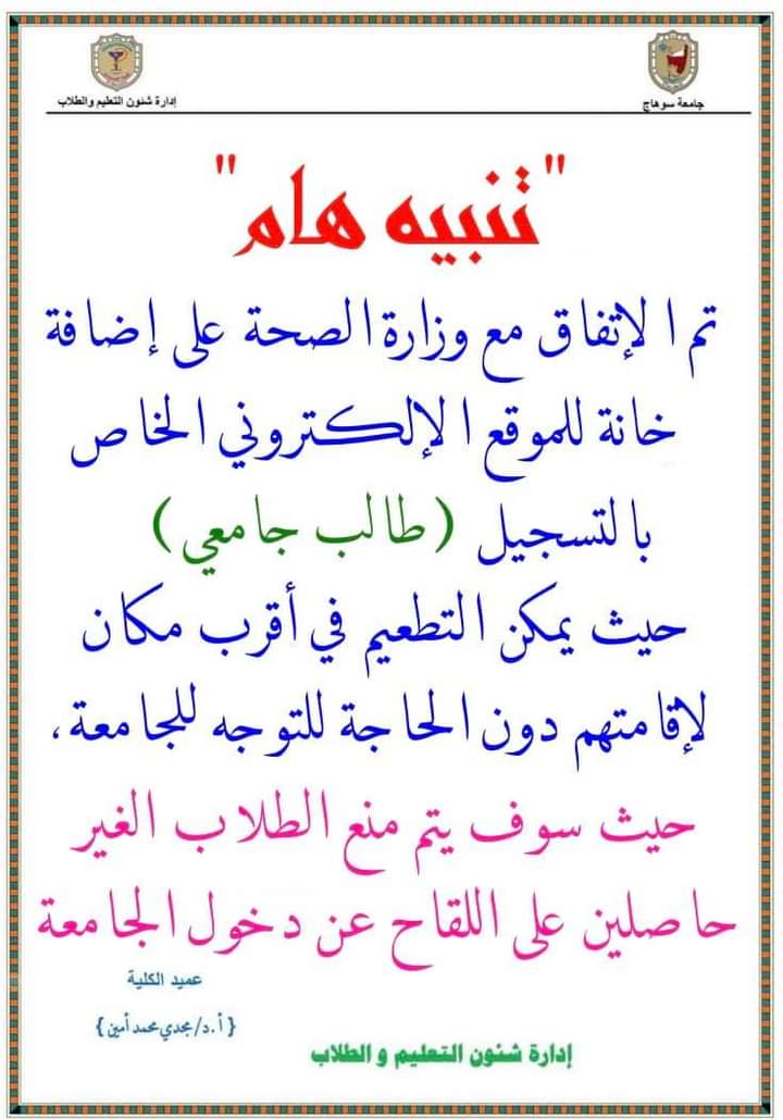 إعلان هام لطلاب الكلية إعلان هام لطلاب الكلية تصفّح المقالات أنا متبرع مصري” حملة للتبرع بالدم ينظمها الإتحاد المصرى لطلاب صيدلة سوهاجإعلان هام لمنتسبى الكلية عن كيفية التسجيل وحجز لقاح كورونا