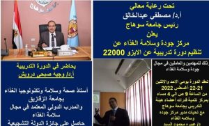 يعلن مركز جودة وسلامة الغذاء بجامعة سوهاج ، عن فتح باب التسجيل للدورة التدريبية” الأيزو 22000″والتى تستهدف كلاً من طلاب كليات الطب البيطرى ، والزراعة، والصيدلة، والعلوم،التربية النوعية وكل الكليات التى لها مجال فى التعامل مع الأغذية، والخريجين.