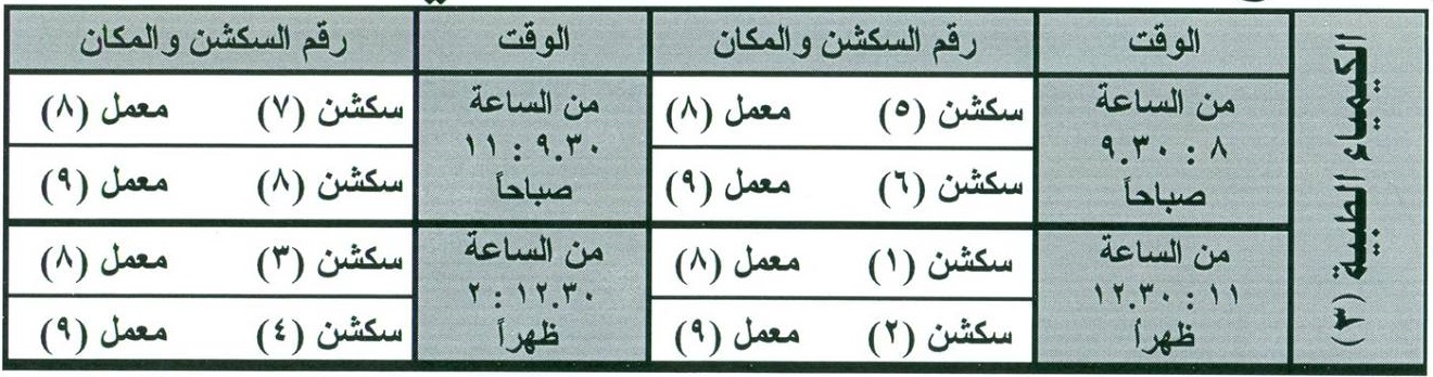تقرر توزيع سكاشن مادة الكيمياء الطبية (3) وذلك يوم الأثنين أسبوعياً وسوف يتم توزيع الطلاب طبقاً للجدول التالي :- توزيع سكاشن مادة الكيمياء الطبية (3) للفرقة الرابعة (قديم) تصفّح المقالات توزيع سكاشن مادة الكيمياء العضوية (3) للفرقة الثانيةتعديل جدول محاضرات والدروس العملية لبرنامج الصيدلة الإكلينيكية