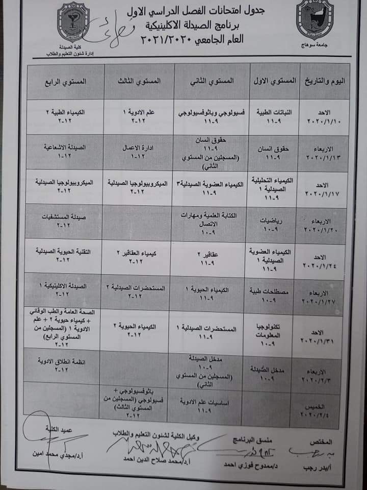 جدول إمتحانات الفصل الدراسى الأول لطلاب برنامج الصيدلة الإكلينيكية للعام الجامعى 2020 /2021 م