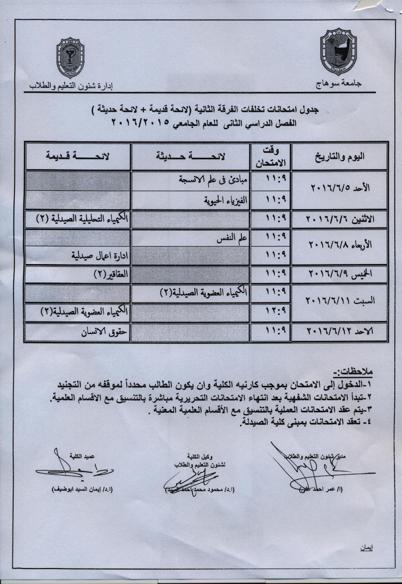 جدول إمتحانات تخلفات الفرقة الثانية (نظام قديم -لائحة جديدة) للفصل الدراسى الثانى للعام الجامعى 2015م/2016م جدول إمتحانات تخلفات الفرقة الثانية (نظام قديم -لائحة جديدة) تصفّح المقالات إعـــلان لطـــلاب الفرقة الثانية (حديث)جدول إمتحانات الفصل الدراسي الثاني للعام الجامعي 2015م/2016م