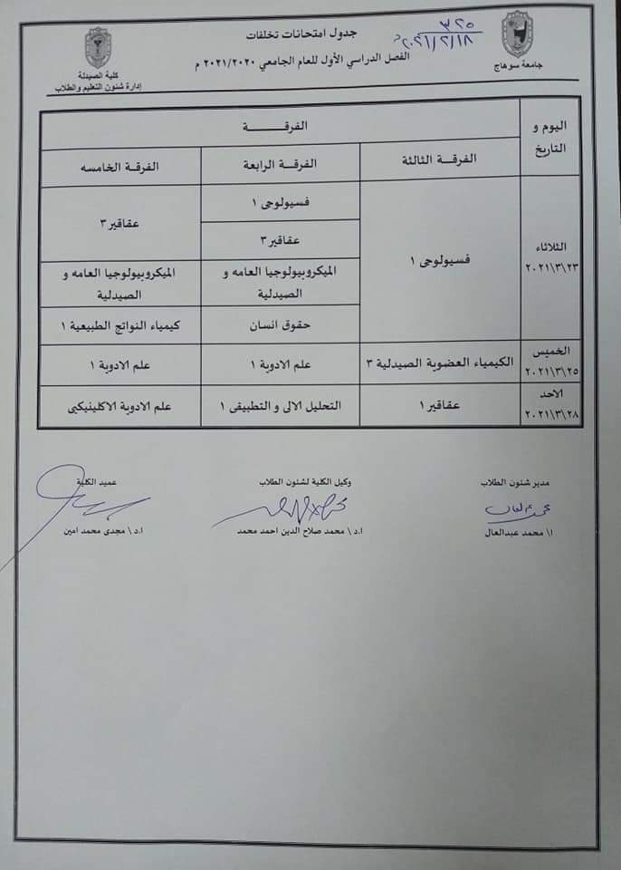 جدول إمتحانات تخلفات الفصل الدراسى الأول للعام الجامعى 2020 /2021 م