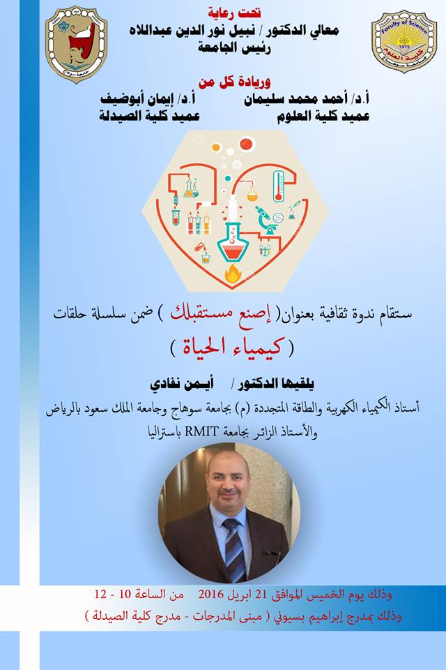 تحت رعاية أ.د/إيمان السيد أبو ضيف عميد الكلية ستقام ندوة ثقافية (أصنع مستقبلك) ضمن سلسلة حلقات (كيمياء الحياة) يلقيها الدكتور /أيمن نفادى أستاذ الكيمياء الكهربية و الطاقة المتجددة (م) بجامعة سوهاج وجامعة الملك سعود بالرياض و الأستاذ الزائر بجامعة RMITيوم الخميس الموافق 21 أبريل 2016م من الساعة العاشرة صباحاً حتى الساعة الثانية عشر ظهراً بمدرج/ إبراهيم بسيونى