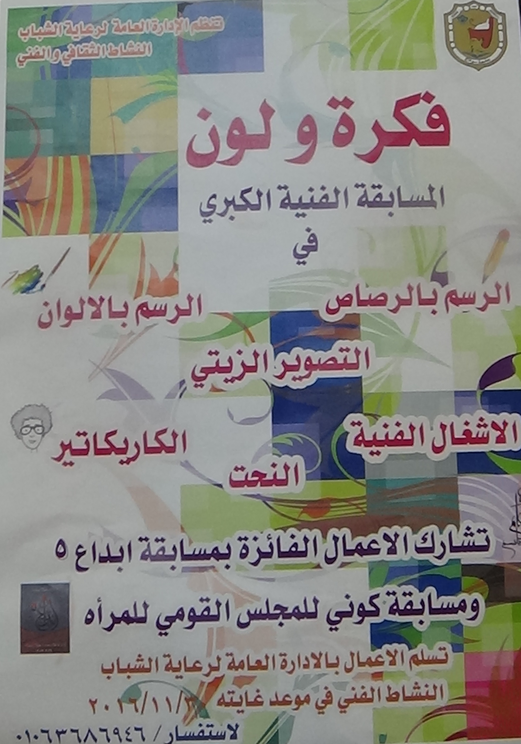 تعلن الإدارة العامة لرعاية الشباب النشاط الثقافي والفني عن تنظيمها للمسابقة الفنية الكبرى (فكرة و لون ) في (الرسم بالرصاص -الرسم بالألوان – االتصوير الزيتي – الأشغال الفنية – الكاريكاتير – النحت ) وتشارك الأعمال الفائزة بمسابقة إبداع 5 ومسابقة كوني للمجلس القومي للمرأه وتسلم الأعمال للإدارة العامة لرعاية الشباب النشاط الفني في موعد غايته 30/11/2016م . –