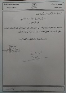 في إطار التعاون بين كليتي الطب البشري والصيدلة تمت الموافقة علي حضور طلاب كلية الصيدلة إلي قاعة الإستذكار الهادئ , علي ألا يزيد عدد حضور الطلبة عن (5) طلبة في نفس موعد الحضور.